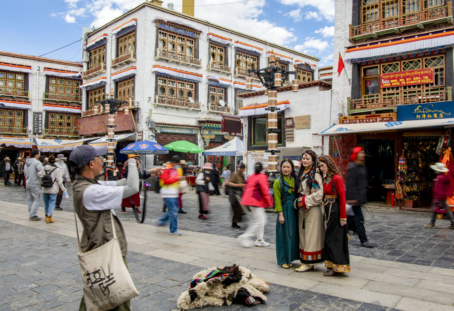 游客身着藏装在拉萨八廓街拍照留念(2023年6月13日摄)。新华社记者 姜帆 摄